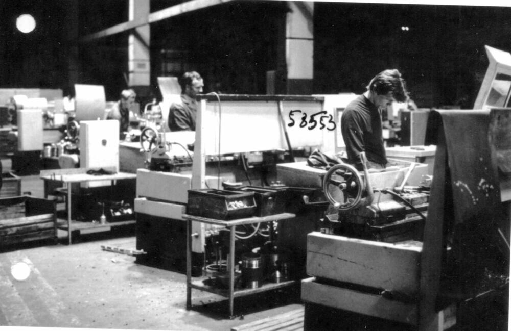 Darba process vienā no Rīgas autoelektroaparātu rūpnīcas cehiem. Otrās maiņas darbinieki pie darba galdiem.