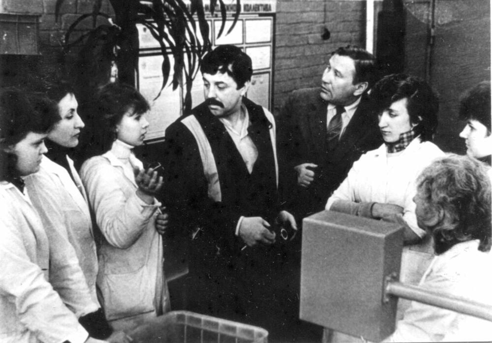 Produkcijas kvalitātes uzlabošanas jautājumu apspriede Rīgas autoelektroaparātu rūpnīcā. Centrā : Valsts pieņemšanas komisijas pārstāvis J. Bogdančenko un rūpnīcas arodbiedrības komitejas priekšsēdētājs E. Apinis.