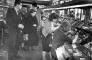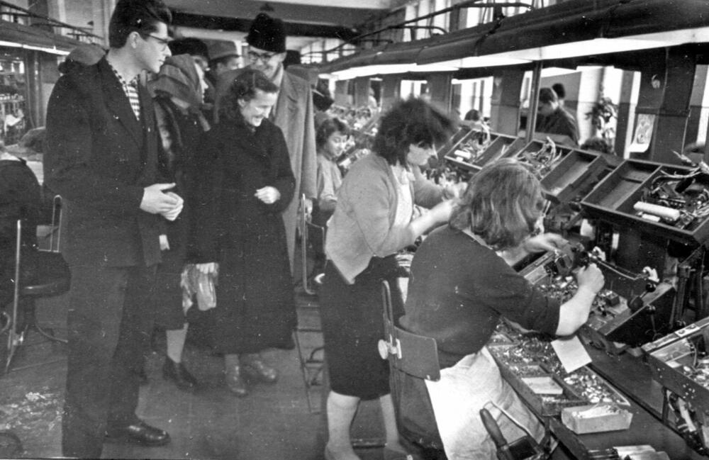 Rīgas autoelektroaparātu rūpnīcas darbinieki ekskursijas laikā A. Popova radiorūpnīcas montāžas cehā.