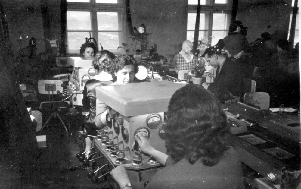 Rīgas autoelektroaparātu rūpnīcas montāžas ceha darbinieki pie ierīču regulēšanas stendiem.