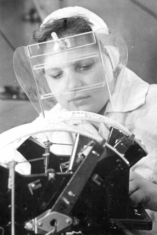 Rīgas autoelektroaparātu rūpnīcas elektromontiere Austra Balode darba laikā.