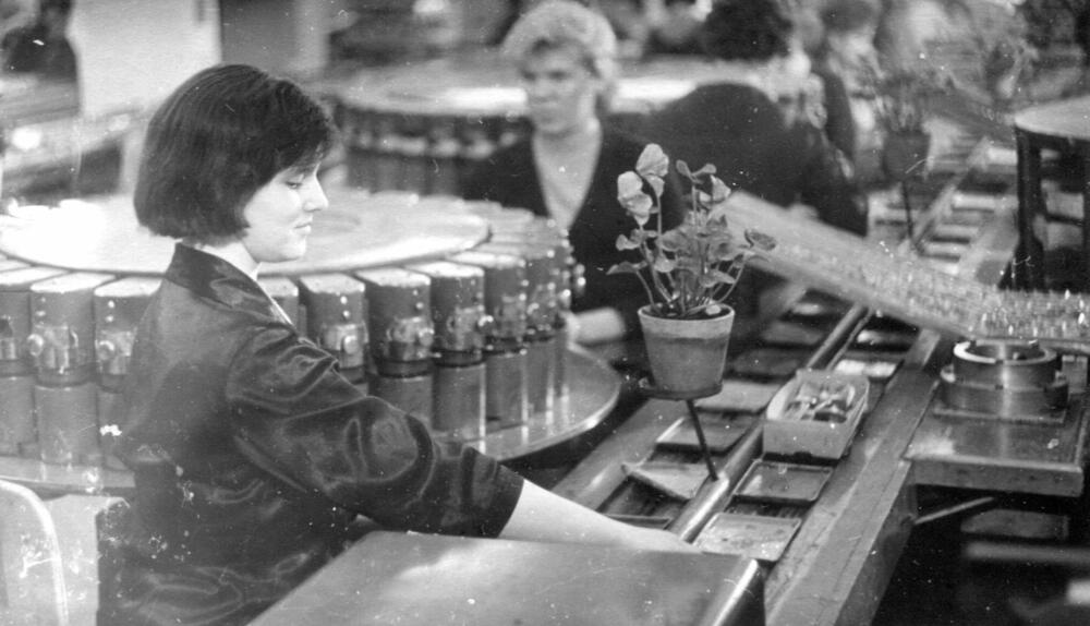 Rīgas autoelektroaparātu rūpnīcas montāžas cehs. Darba process pie ierīces "MM-9" montāžas konveijera.