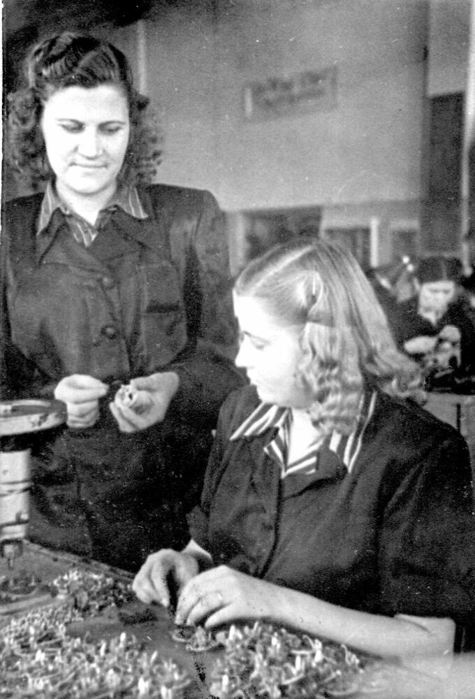 Rīgas autoelektroaparātu rūpnīca. Tehniskās kontroles nodaļas kontroliere Valentīna Beikmane un montāžas ceha darbiniece Elza Nelsone veic detaļu kvalitātes kontroli.