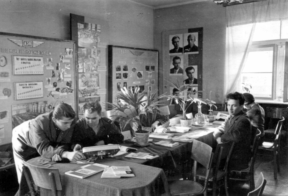 Rīgas autoelektroaparātu rūpnīca. Tehniskās informācijas biroja tehniķis Valērijs Rudņevs (no kreisās) ar kolēģiem darba kabinetā.
