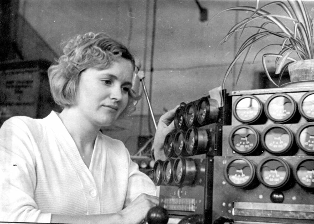 Rīgas autoelektroaparātu rūpnīcas darbiniece Vera Apsīte veic iekārtu kvalitātes kontroli, kas ražotas eksportam.
