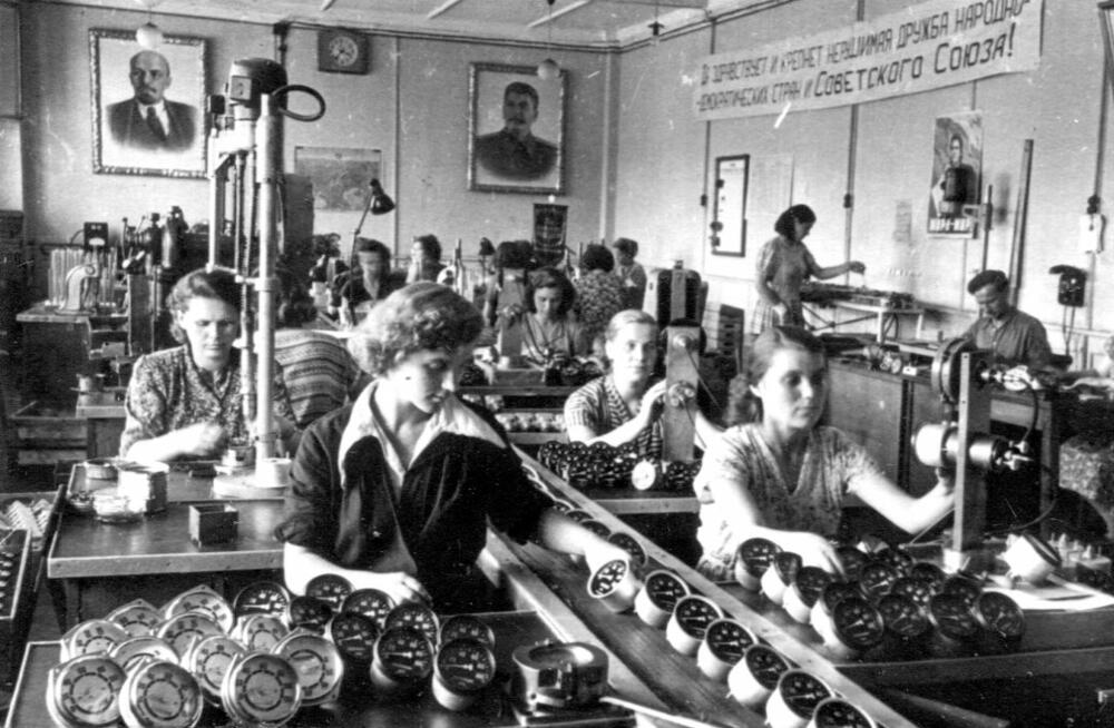 Rīgas autoelektroaparātu rūpnīca. Darba process pie spidometru montāžas konveijera.