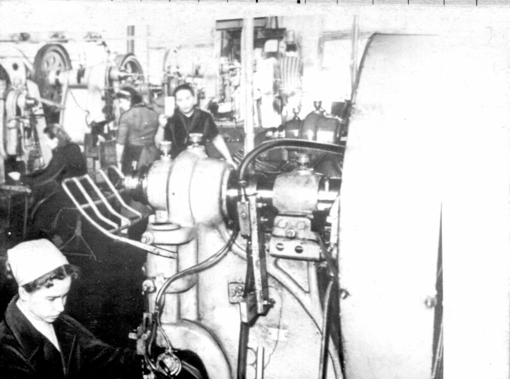 Rīgas autoelektroaparātu rūpnīcas montieru brigāde. Priekšplānā : V. Karaseva.