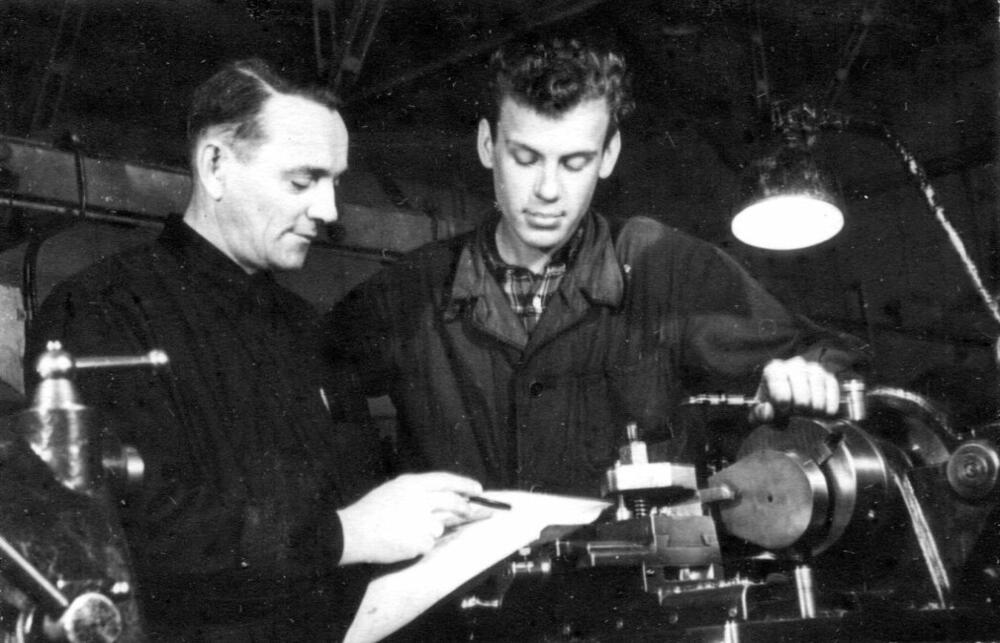 Rīgas autoelektroaparātu rūpnīcas instrumentu atslēdznieks ar amata mācekli E. Šuļko pie darba galda.