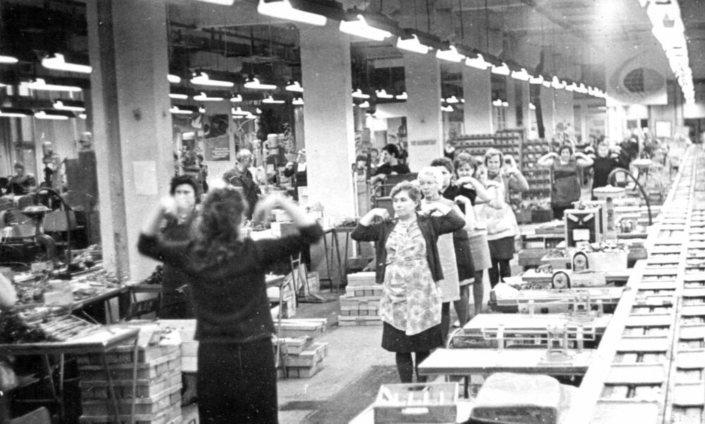 Rīgas autoelektroaparātu rūpnīca. Vingrošanas pauze montāžas cehā.