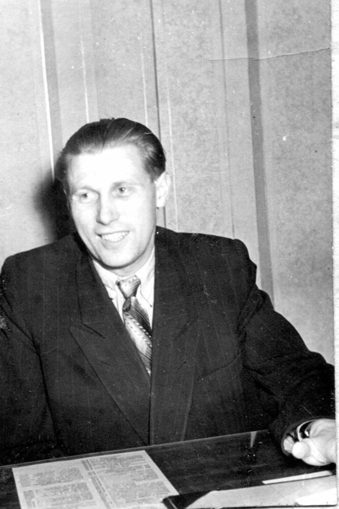 Rīgas autoelktroaparātu rūpnīcas direktors Kārlis Svilpe pie darba galda.