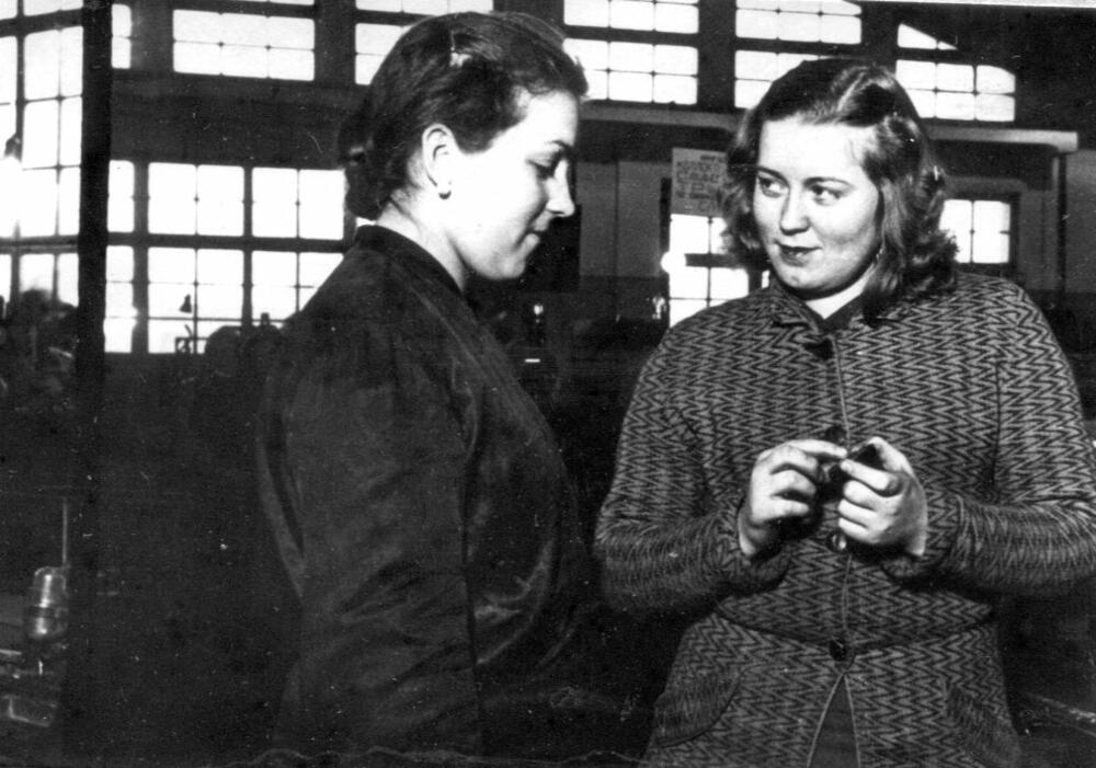 Rīgas autoelektroaparātu rūpnīcas darbinieces Vera un Vita Steckas uzņēmuma cehā.