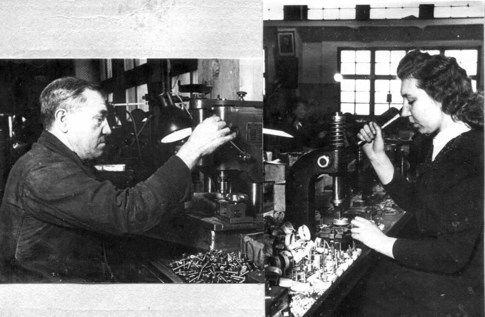 Rīgas autoelektroaparātu rūpnīcas urbējs I. Peršins ar meitu T. Peršinu pie darba galdiem.