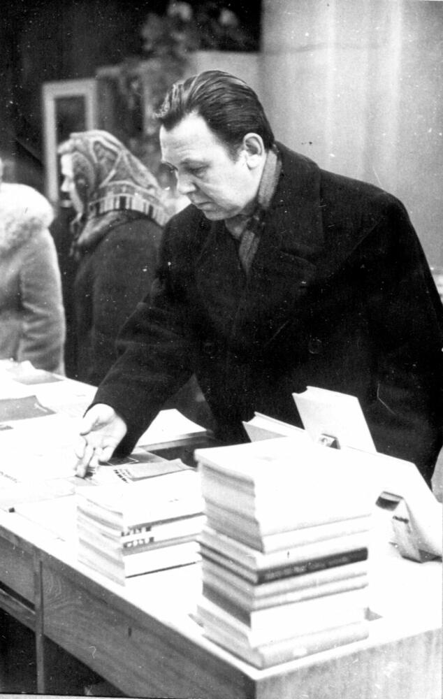 Rīgas autoelektroaparātu rūpnīcas instrumentālā ceha virpotājs, Latvijas PSR Augstākās Padomes deputāts Arnis Kārkliņš grāmatu veikalā.