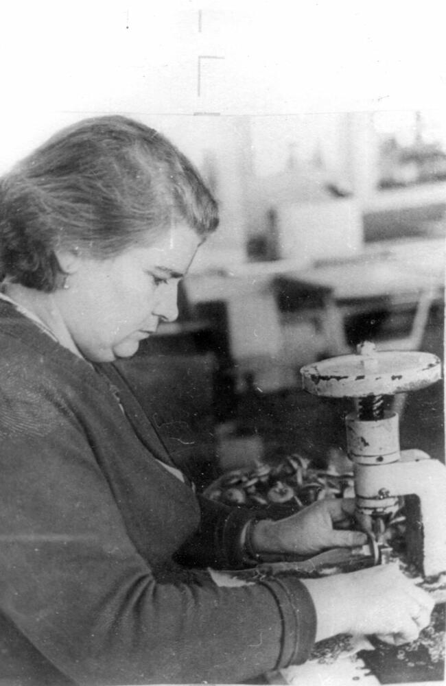 Rīgas autoelektroaparātu rūpnīcas atslēdzniece Jevdokija Bardina pie darba galda.
