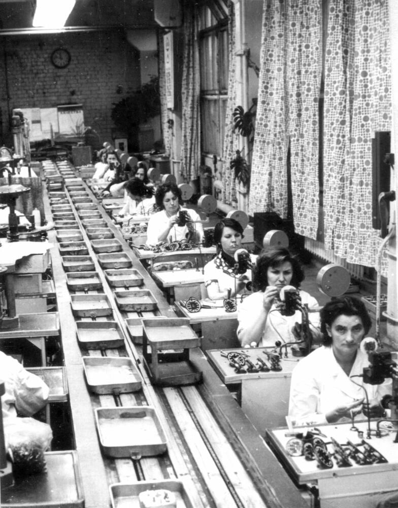 Rīgas autoelektroaparātu rūpnīca. Darba process pie konveijera montāžas cehā.