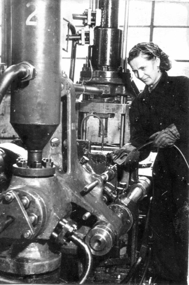 Rīgas autoelektroaparātu rūpnīcas liešanas ceha darbiniece Olga Rudzevska darba laikā.