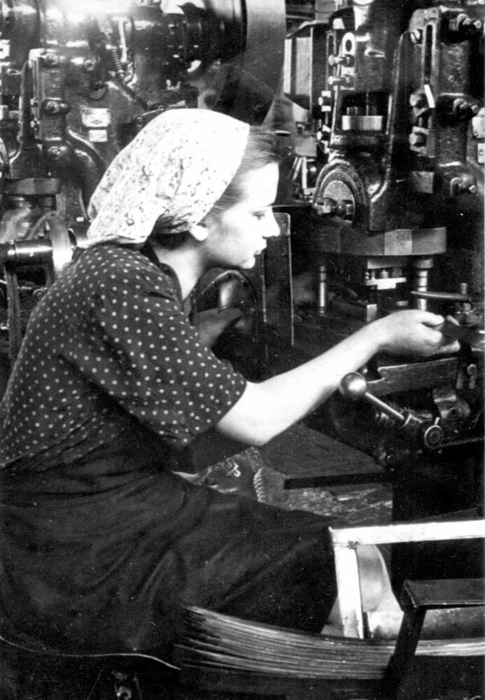 Rīgas autoelektroaparātu rūpnīcas štancēšanas iecirkņa darbiniece L. Siktare pie darba galda.
