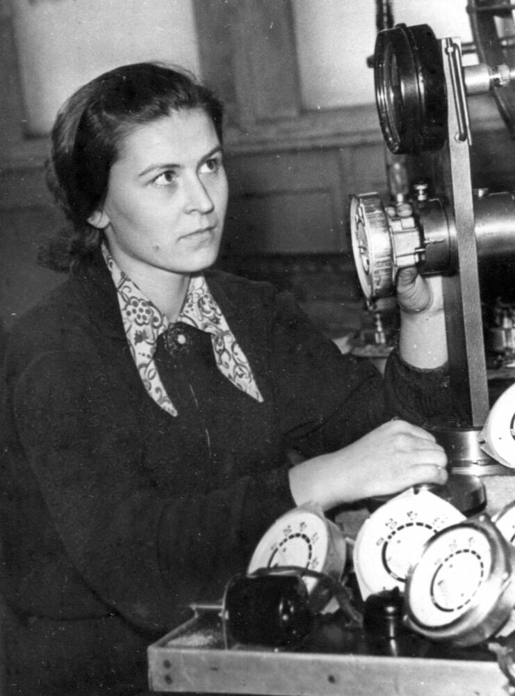 Rīgas autoelektroaparātu rūpnīcas darbiniece V. Zīriņa pie spidometru regulēšanas iekārtas.