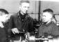 Rīgas autoelektroaparātu rūpnīcas instrumentālā ceha virpotājs J. Makarevičs dalās darba pieredzē ar amata mācekļiem Jakovļevu un Miņinu.