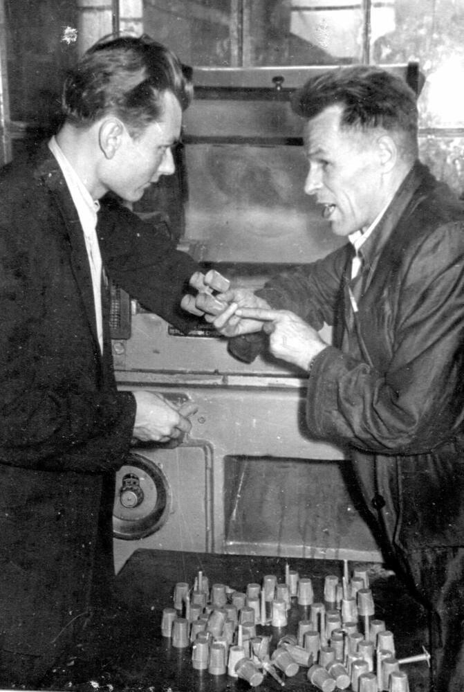 Rīgas autoelektroaparātu rūpnīcas vecākais konstruktors Voldemārs Kalniņš (no kreisās) un vecākais tehnologs Vladimirs Sevčenko veic gatavās produkcijas kvalitātes kontroli.