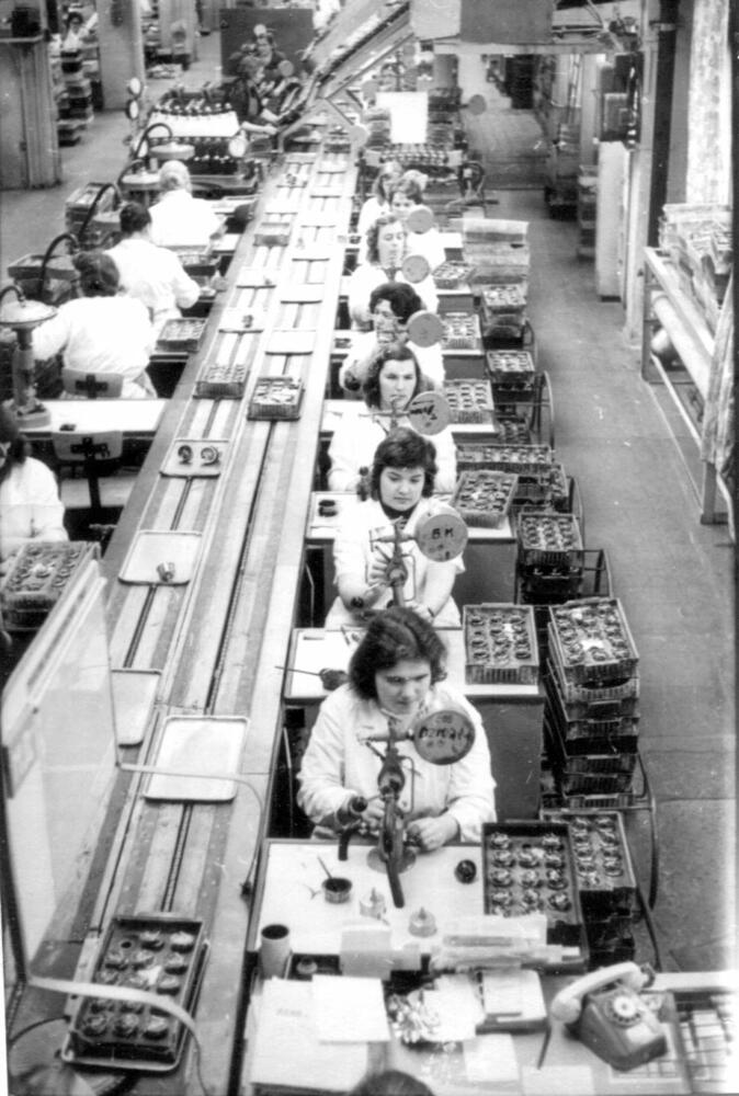 Rīgas autoelektroaparātu rūpnīcas montāžas cehs. Darba process pie manometru montāžas konveijera.