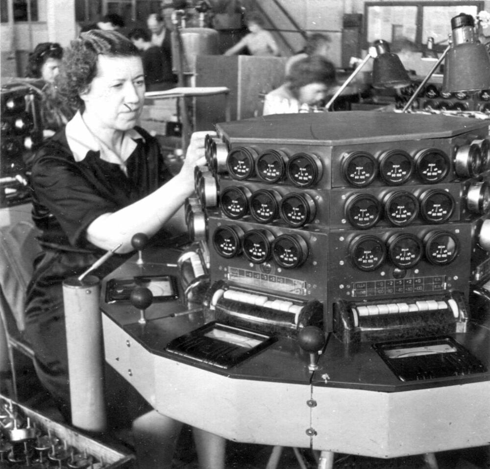 Rīgas autoelektroaparātu rūpnīcas tehniskās kontroles nodaļas kontroliere A. Veihmane veic gatavās produkcijas kvalitātes kontroli.