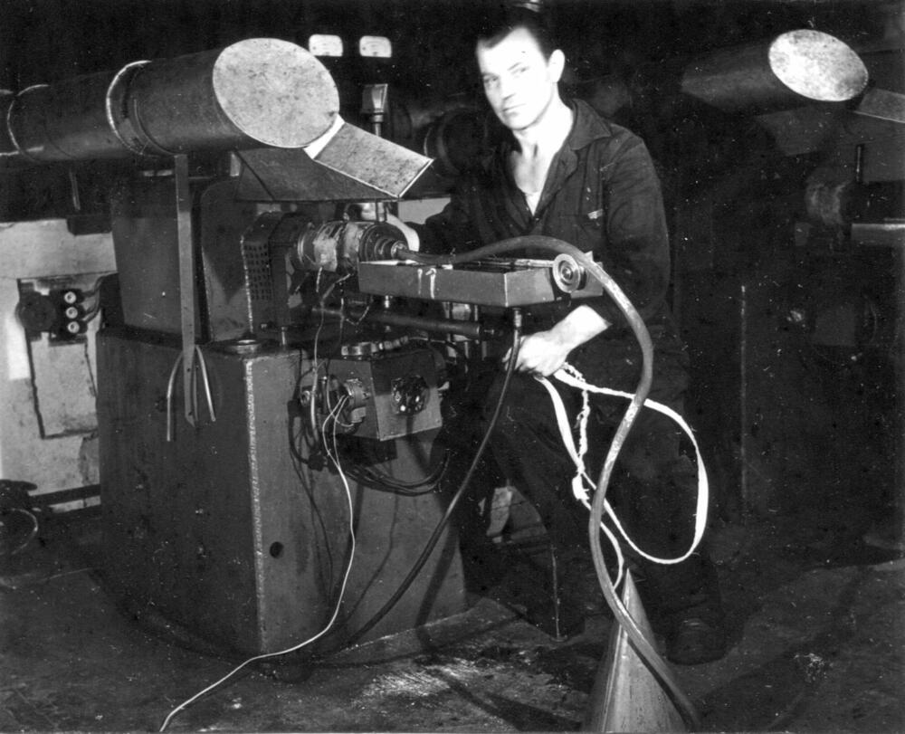 Rīgas autoelektroaparātu rūpnīcas presēšanas ceha darbinieks pie darba galda.