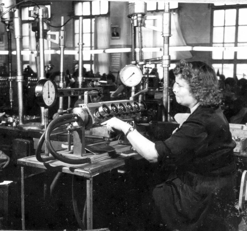 Rīgas autoelektroaparātu rūpnīcas montāžas ceha darbiniece pie ierīču regulēšanas darba galda.