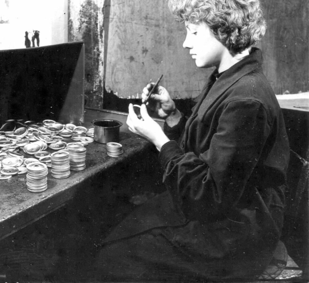 Rīgas autoelektroaparātu rūpnīcas presēšanas ceha darbiniece pie darba galda.