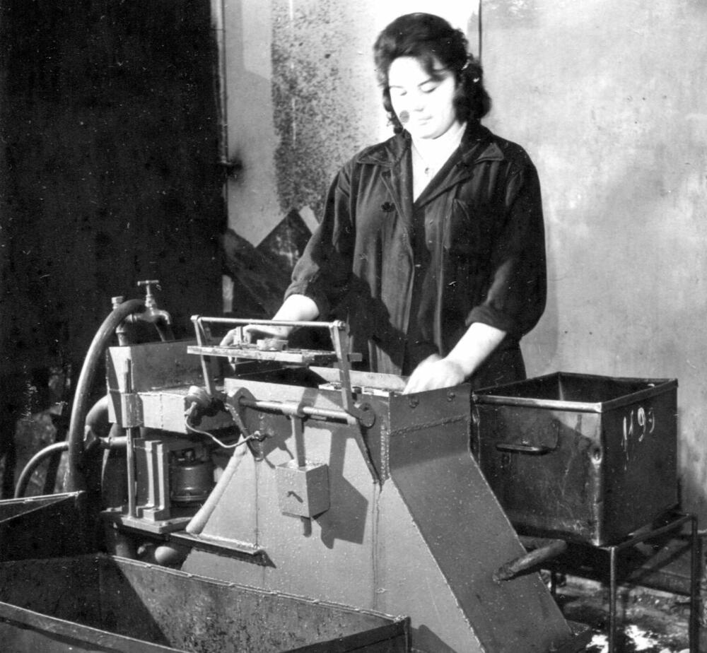 Rīgas autoelektroaparātu rūpnīcas liešanas ceha darbiniece pie darba galda.