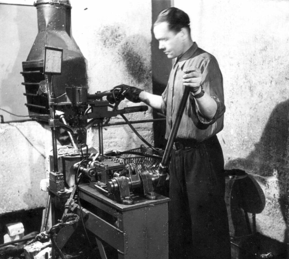 Rīgas autoelektroaparātu rūpnīcas liešanas cehs. Darba process pie liešanas mašīnas.