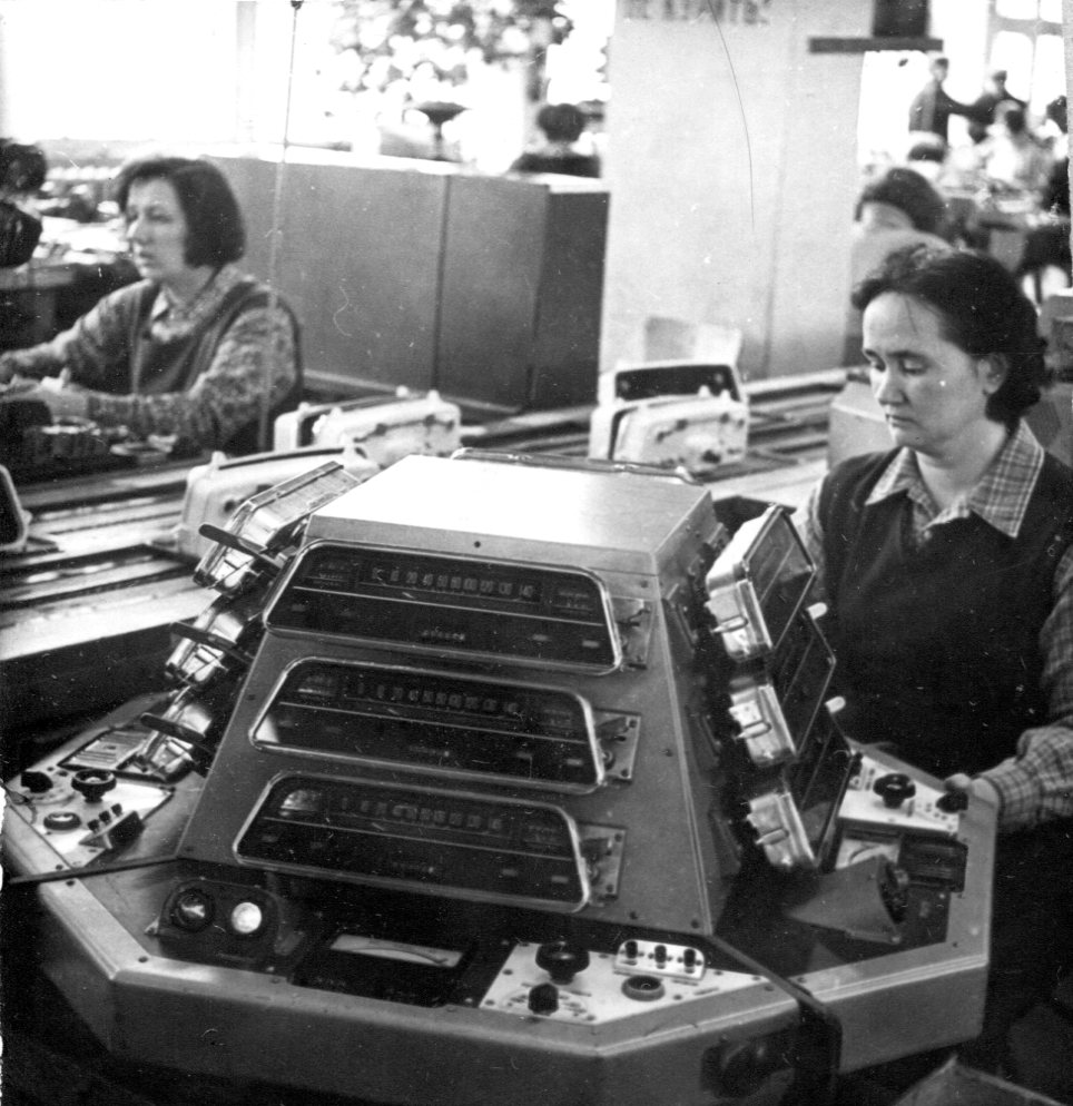 Rīgas autoelektroaparātu rūpnīcas darbiniece G. Zujeva pie automašīnu vadības paneļu kvalitātes kontroles iekārtas.