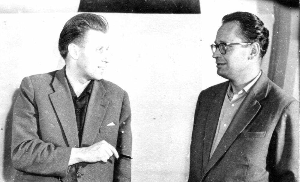 Rīgas autoelektroaparātu rūpnīcas direktors Kārlis Svilpe (no kreisās) un galvenais inženieris V. Kirjuhins darba laikā.