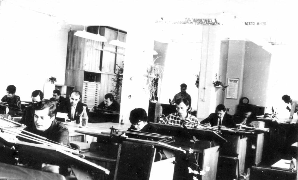Darba process Rīgas autoelektroaparātu rūpnīcas konstruktoru birojā.