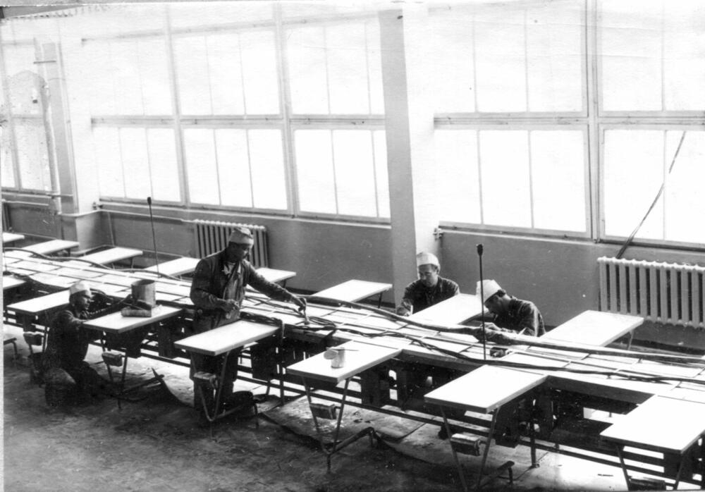 Konveijera krāsošanas darbi Rīgas autoelektroaparātu rūpnīcas jaunajā montāžas cehā.