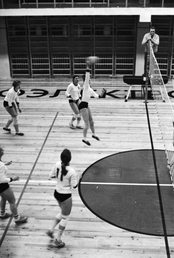 Rīgas autoelektroaparātu rūpnīcas sporta kompleksā volejbolu spēlē autoelektroaparātu rūpnīcas volejbolistes.