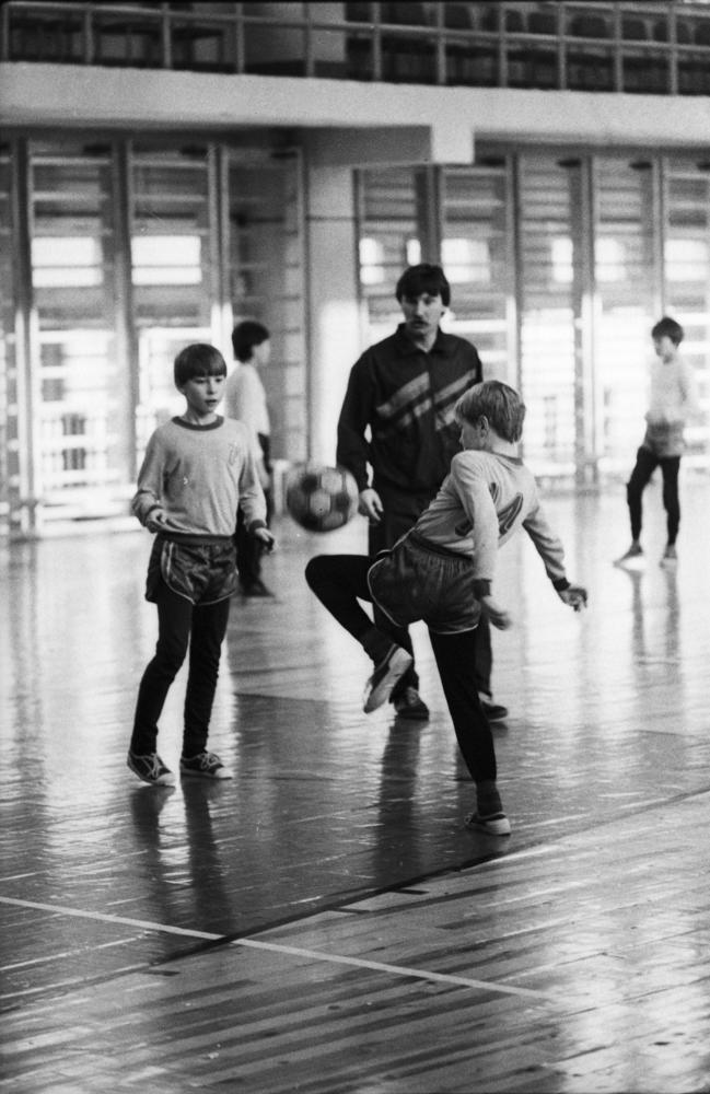 Rīgas autoelektroaparātu rūpnīcas sporta kompleksā rit nodarbības jauniešiem futbolā.