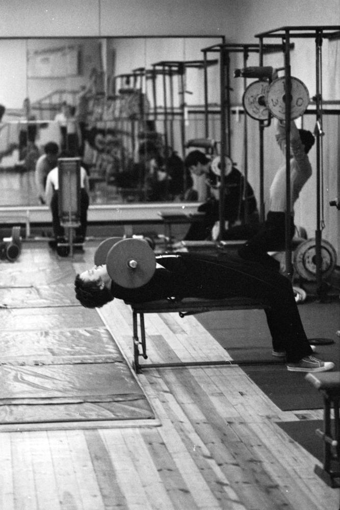 Nodarbības Rīgas autoelektroaparātu rūpnīcas sporta kompleksa svaru zālē.