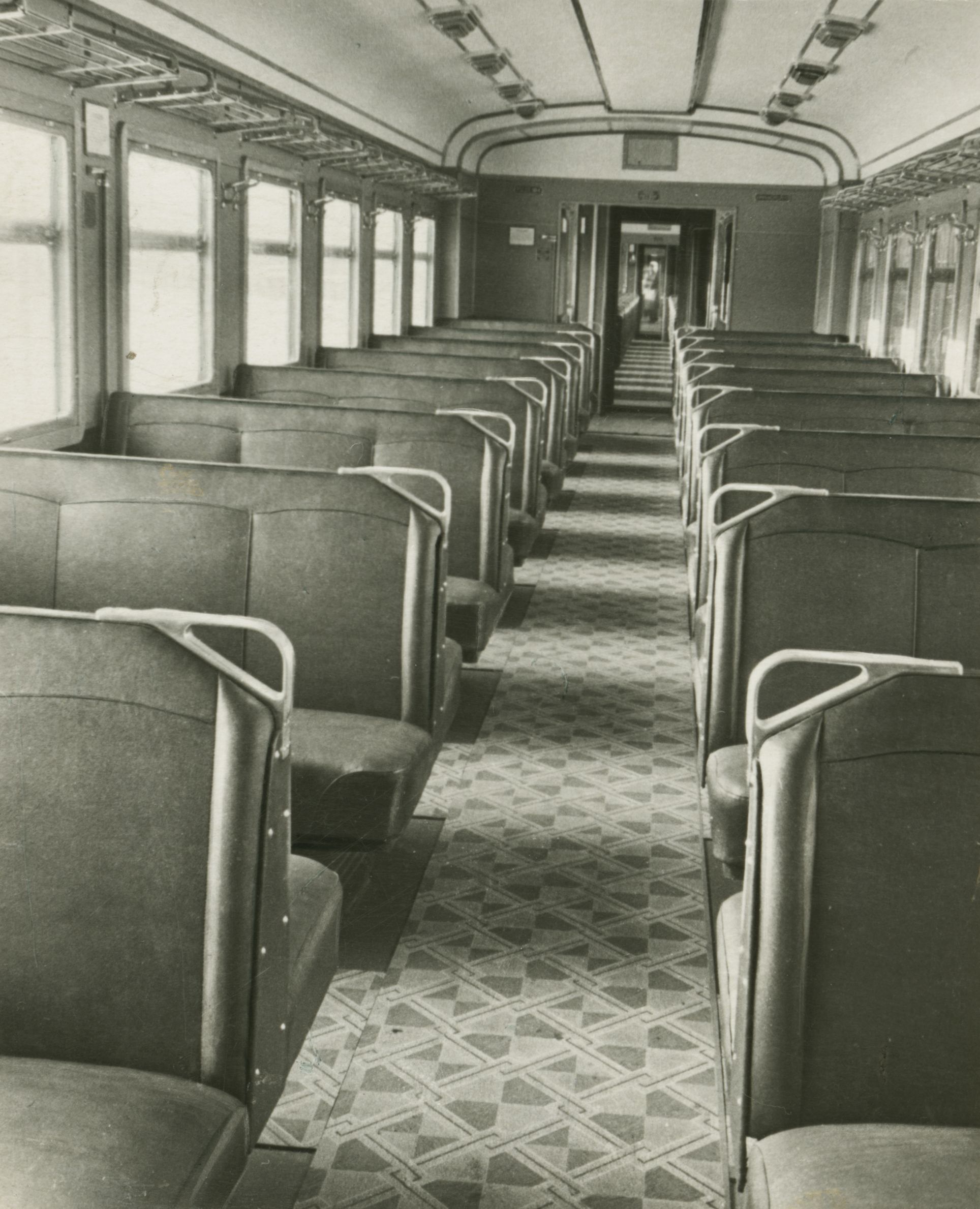 Rīgas Vagonu rūpnīcā (RVR) būvētā elektrovilciena vagona iekšskats.