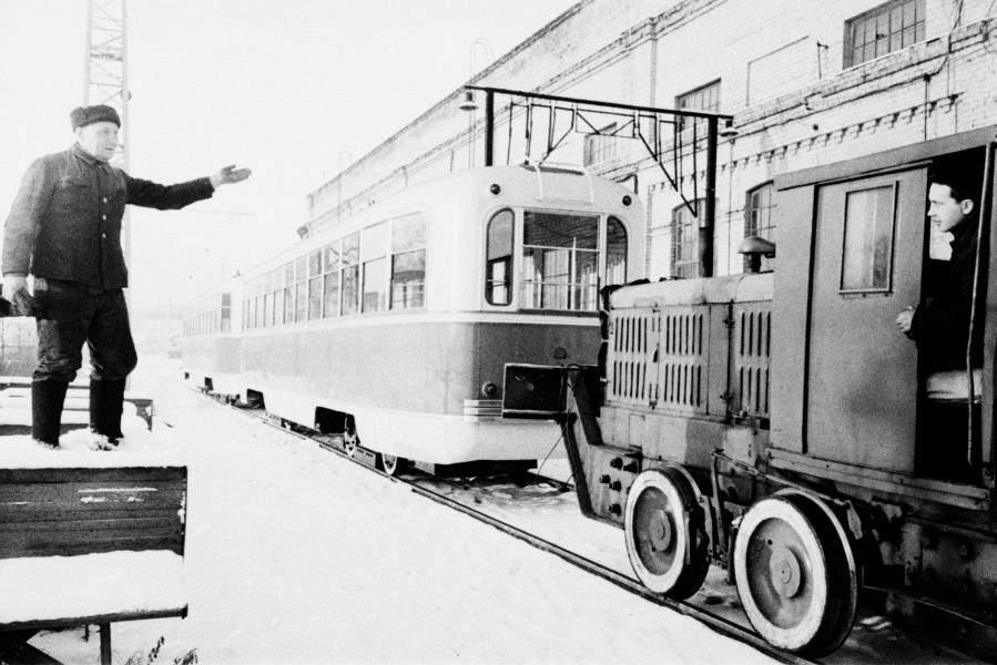 Tramvaja transportēšana Rīgas vagonu rūpnīcas (RVR) teritorijā.