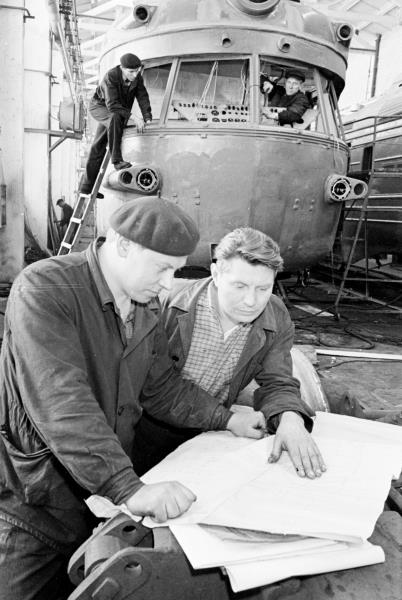 Rīgas vagonu rūpnīcas (RVR) jaunās tehnikas ceha atslēdznieki-montētāji G. Rjabovs un P. Ļeonovs.