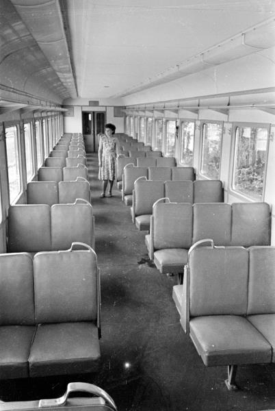 Rīgas vagonu rūpnīcas (RVR) izgatavotā pirmā dīzeļvilciena DR-1 „Baltika” piekabināmā vagona iekšskats.