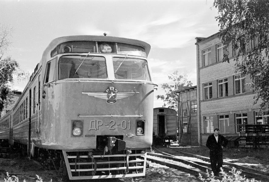 Rīgas vagonu rūpnīcas (RVR) dīzeļvilciens DR-2-01 rūpnīcas teritorijā. Vilciens sasniedz ātrumu līdz 120 km stundā, tā veidošanā piedalījās vairāki PSRS uzņēmumi.