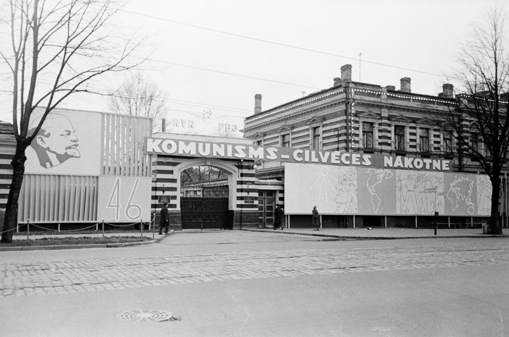 Skats uz Rīgas vagonu rūpnīcas (RVR) galvenajiem vārtiem un administratīvo ēku Oktobra sociālistiskās revolūcijas gadadienas svētku noformējumā ar uzrakstu "Komunisms cilvēces nākotne".