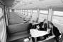 Rīgas vagonu rūpnīcas (RVR) mašīnists izmēģinātājs K. Gerasimovs (no kreisās), inženieri konstruktori I. Kelims un E. Zjukovs vilciena pasažieru salonā.