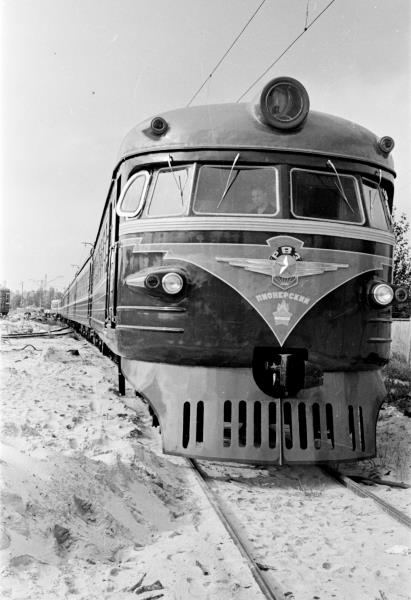 Rīgas vagonu rūpnīcā (RVR) no Rīgas pionieru savāktajiem metāllūžņiem izgatavotais pirmais sērijveida desmit vagonu elektrovilciens „Pionieru” ("Пионерский") brauciena laikā ziemā.