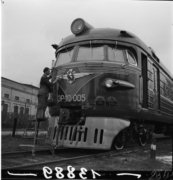 Rīgas vagonu rūpnīcas (RVR) elektrovilciena ER-10-005 izmēģinājuma parauga sagatavošana nosūtīšanai uz Vissavienības dzelzceļa jaunās tehnikas izstādi Maskavā.