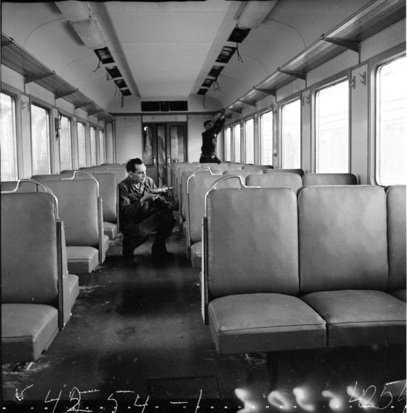 Sēdekļu uzstādīšana Rīgas vagonu rūpnīcas (RVR) izgatavotajā pirmajā dīzeļvilcienā.