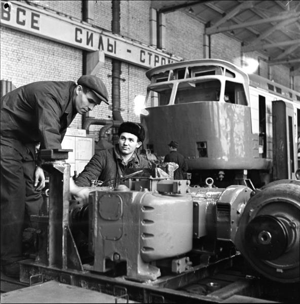 Rīgas vagonu rūpnīcas (RVR) Jaunās tehnikas ceha atslēdznieki Vladimirs Kozaks un Aleksandrs Nikoļskis montē dīzeļvilciena DR-2 enerģētiskās iekārtas palīgierīci.