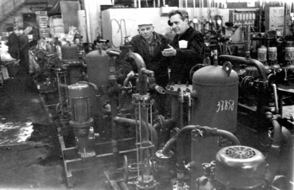 Ar Darba Sarkanā Karoga ordeni apbalvotā Rīgas ķīmiskās mašīnbūves rūpnīca "Rigahimmaš". Montāžas ceha atslēdznieks Jānis Tomsons (no kreisās) un ceha vadītāja vietnieks Valdis Kaģis veic gāzes bloku tehniskā stāvokļa kontroli.